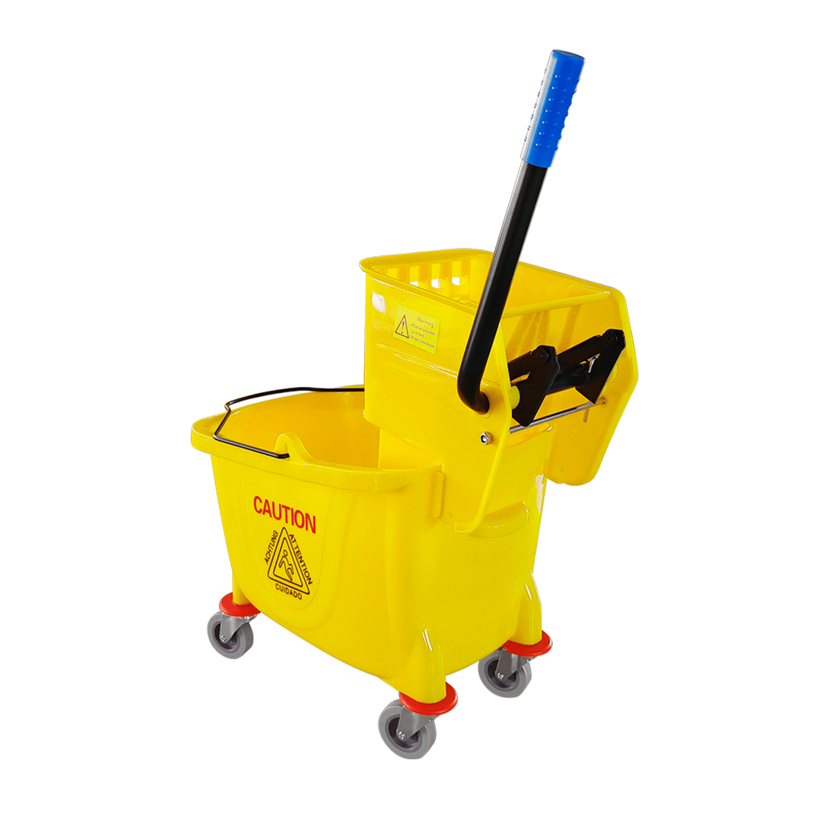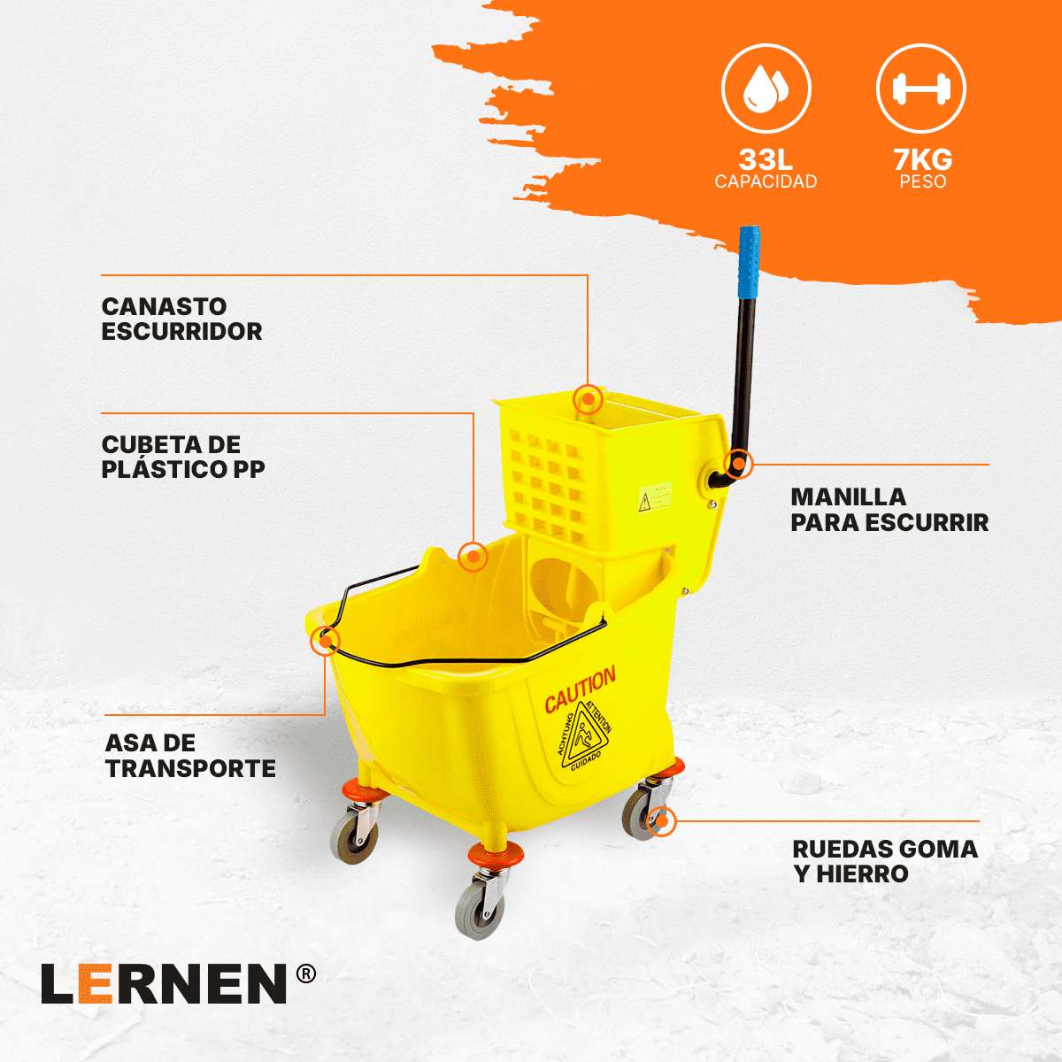 Carro estrujador de aseo de 33 Litros, limpia sin necesidad de mezclar las manos con la suciedad, gracias a su sistema de estrujado automático, plástico alta resistencia, industrial.
