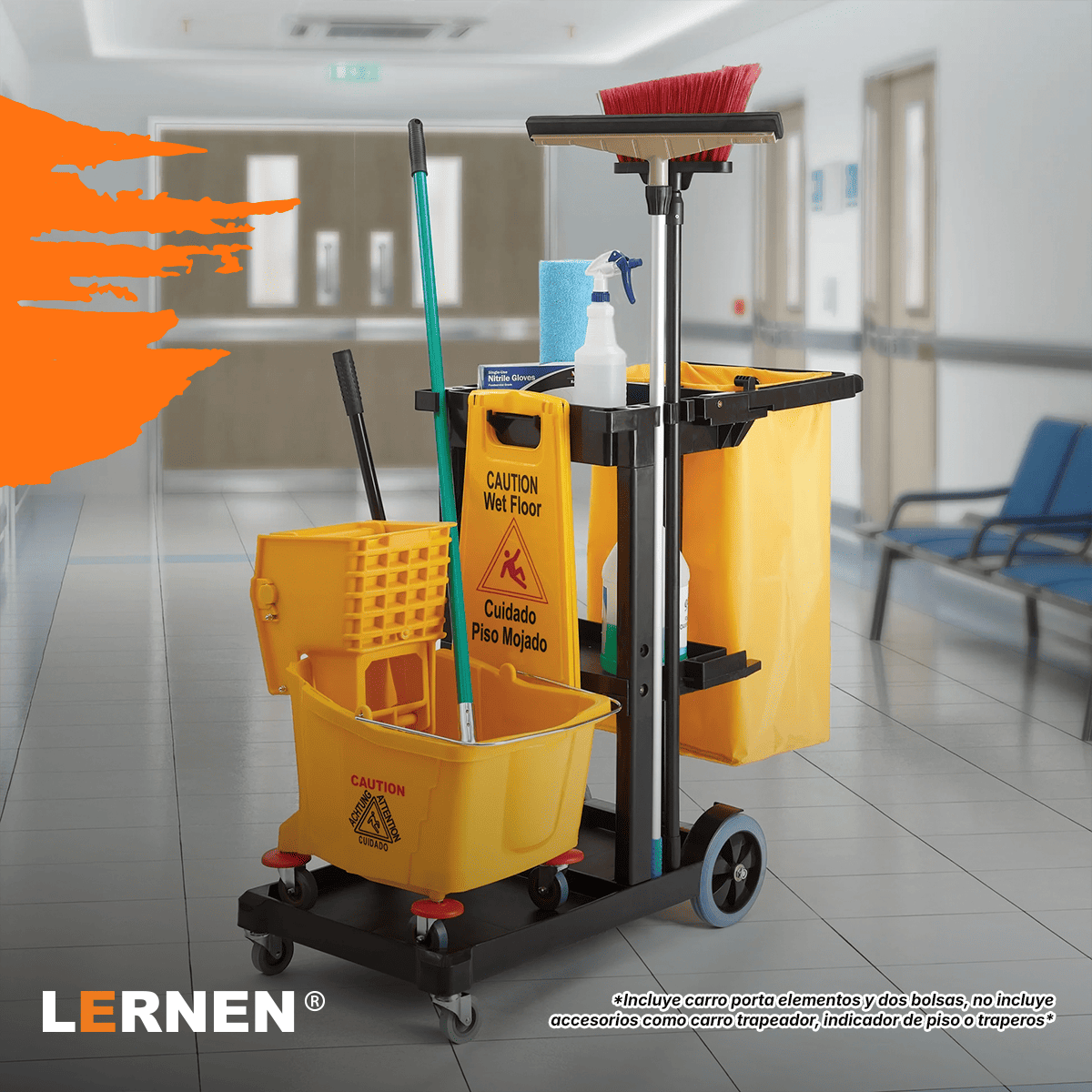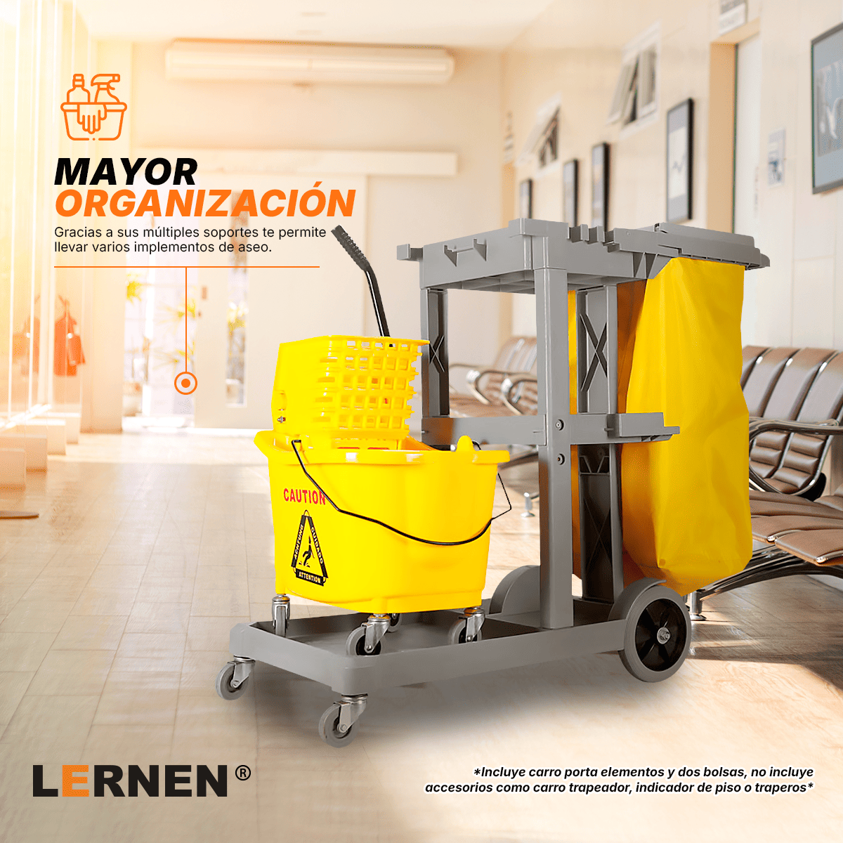 Carro de Aaseo Porta Útiles profesional ideal para limpieza, mantenimiento y uso institucional. Incluye base integrada para colocar una aspiradora, carro estrujador u otros equipos, permitiendo trabajar con mayor orden y eficiencia. Su estructura de plástico resistente, sus amplias bandejas y sus dos bolsas de gran capacidad lo convierten en una solución práctica para hoteles, oficinas, clínicas, colegios y labores de aseo en general.