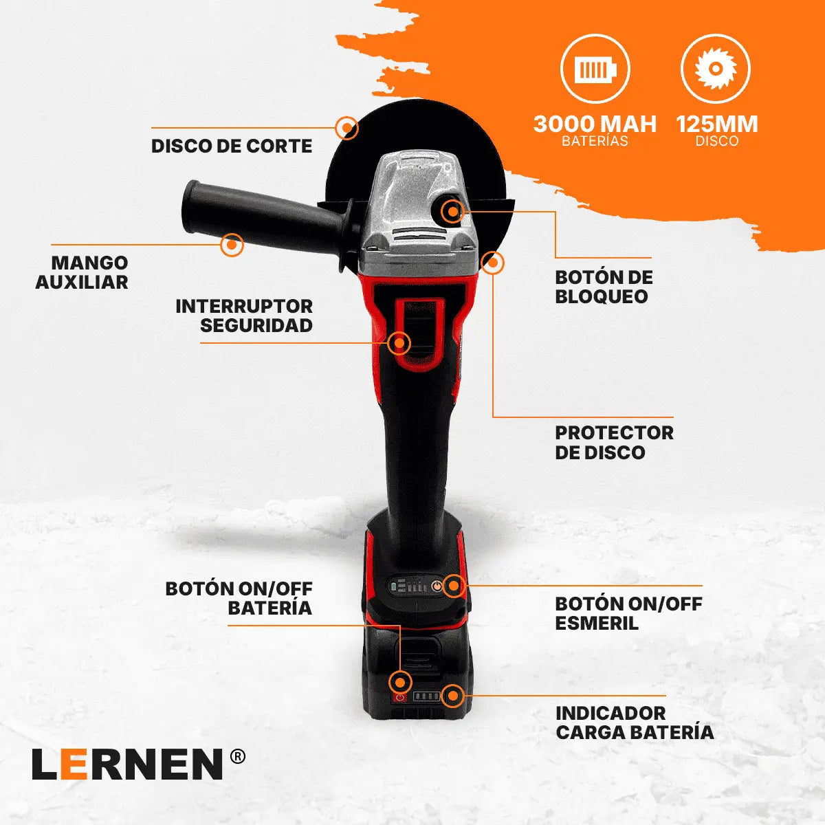 Cuenta con un disco de 125 mm, ideal para aplicaciones profesionales y domésticas. Incluye dos baterías recargables de 3000 mAh (5C), que permiten trabajar de forma continúa reduciendo tiempos de detención por carga.