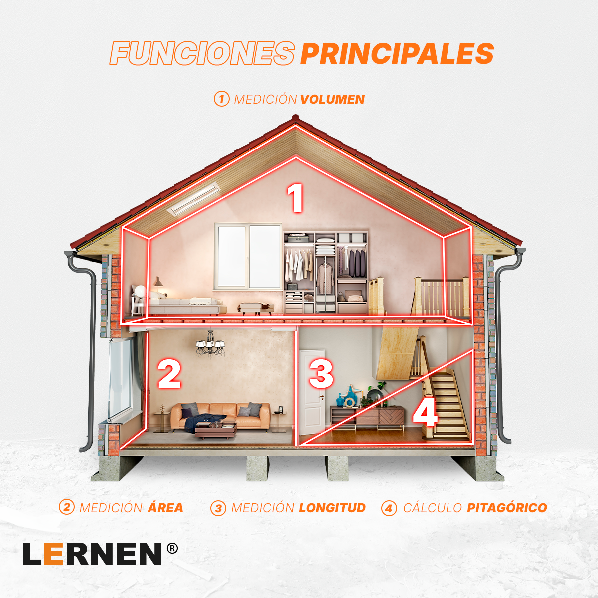 - Función de medición: Medición única, mediciones continuas, Área, volumen, pitágoras, Suma y Resta