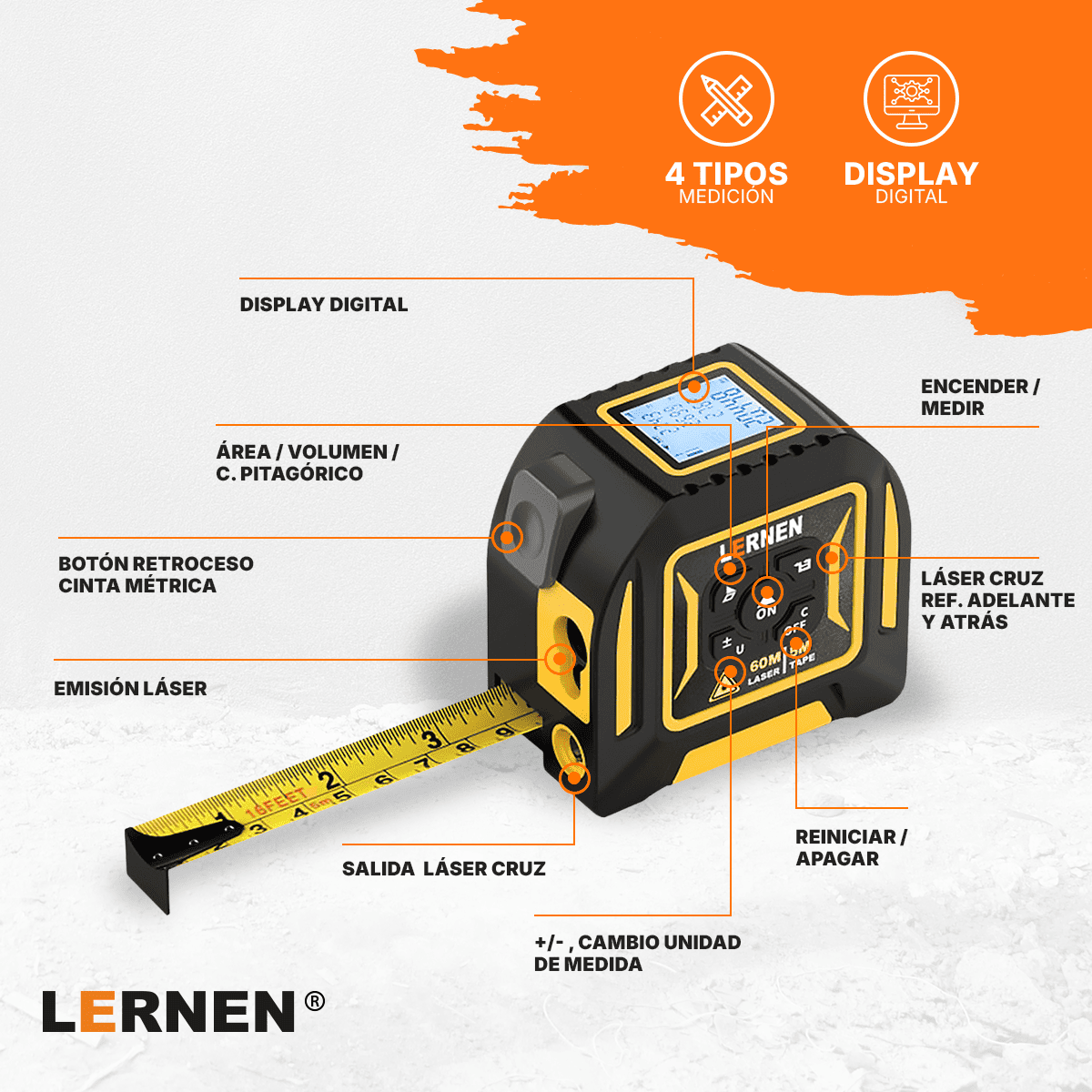 Fácil de usar, liviano y muy funcional, este medidor láser con huincha es una herramienta esencial para profesionales y entusiastas que buscan mediciones rápidas, confiables y sin complicaciones