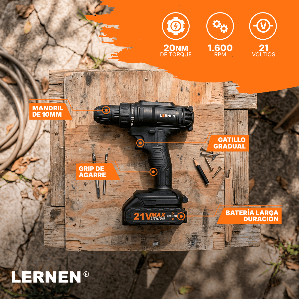 Taladro Destornillador Inalámbrico LERNEN + 1 Batería + Acc